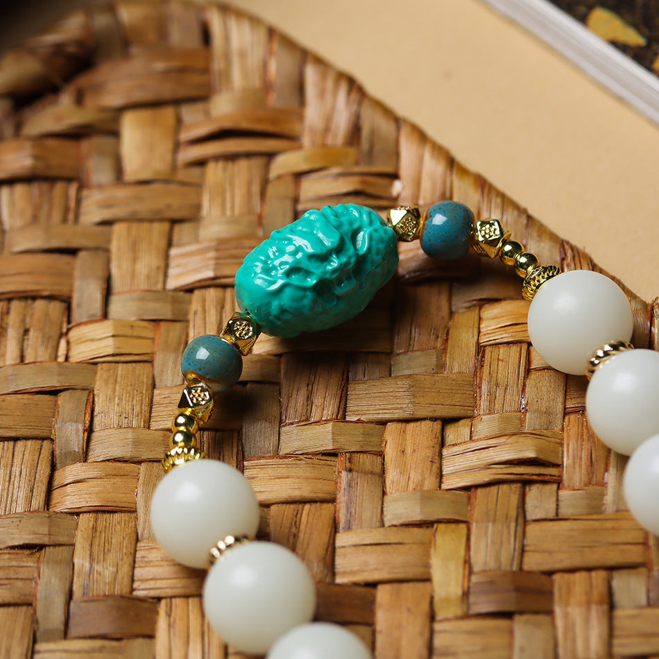 The luminous white jade beads radiate purity and calm, grounding your presence through movement and stillness alike. The turquoise-look accents bring a fresh vibrancy and protective energy, while the safety buckle symbolizes safety, harmony, and protection. Over time, the bodhi beads become smoother and glossier with regular touch, deepening the living connection between your spiritual practice and daily life.