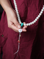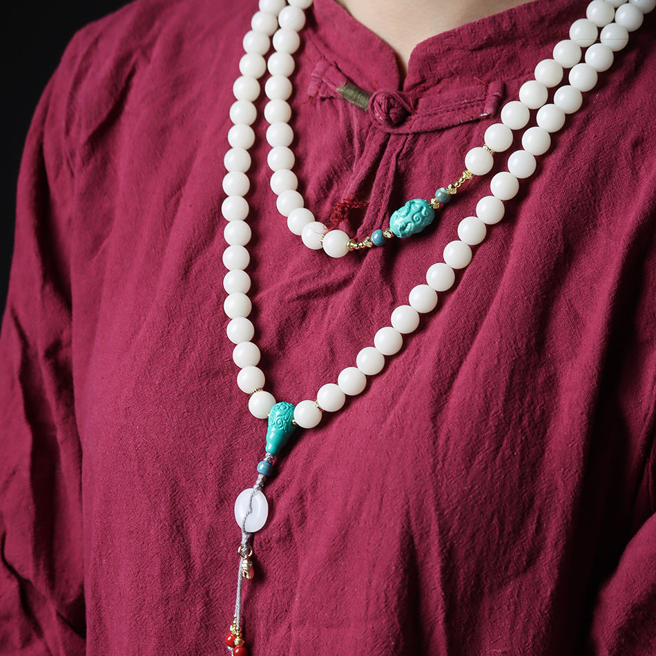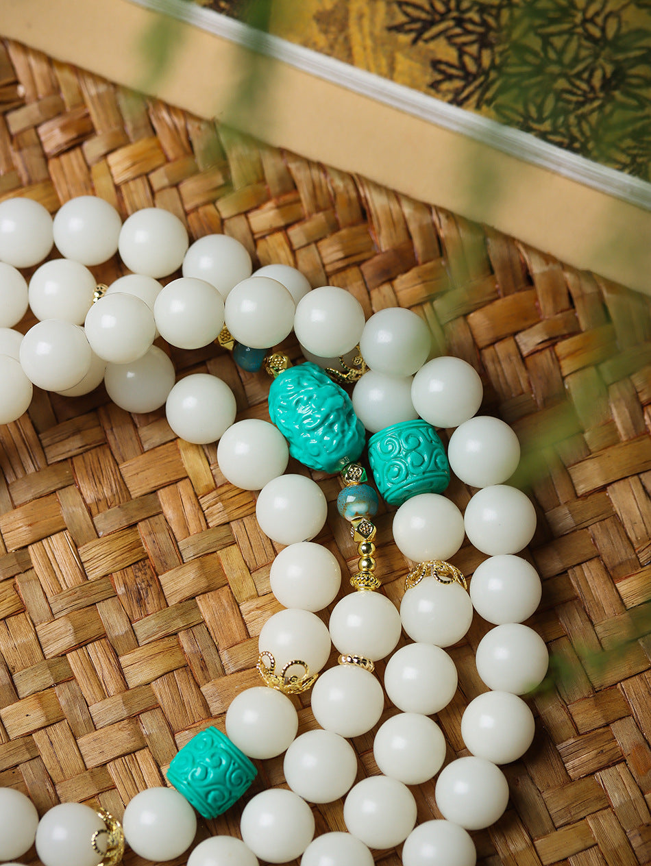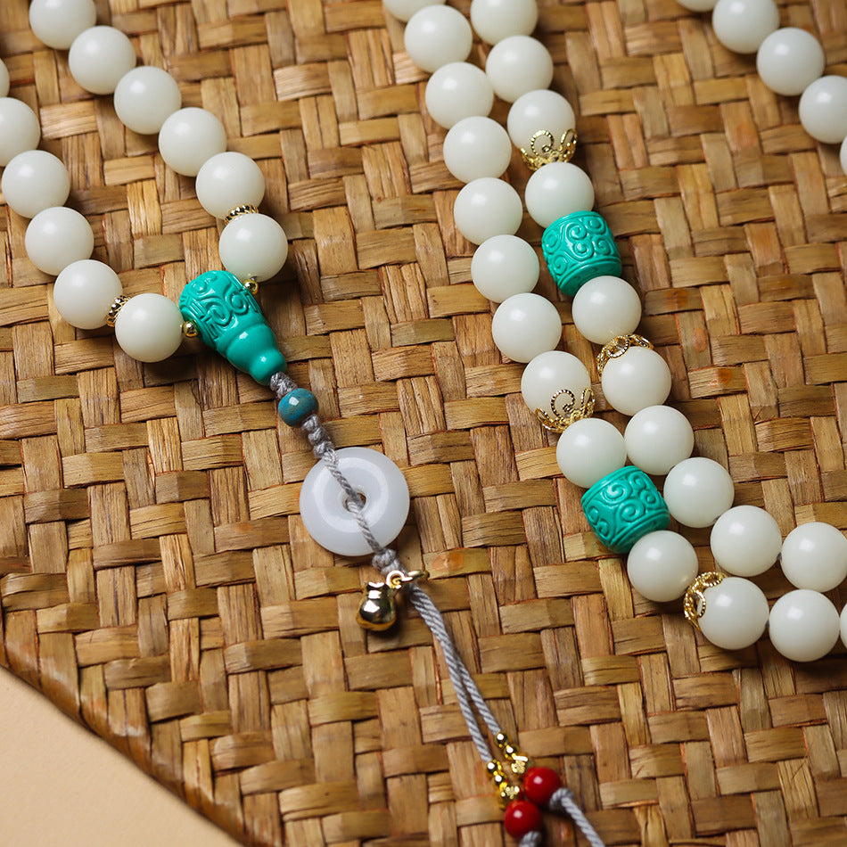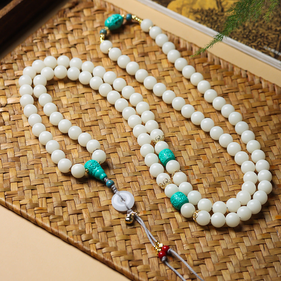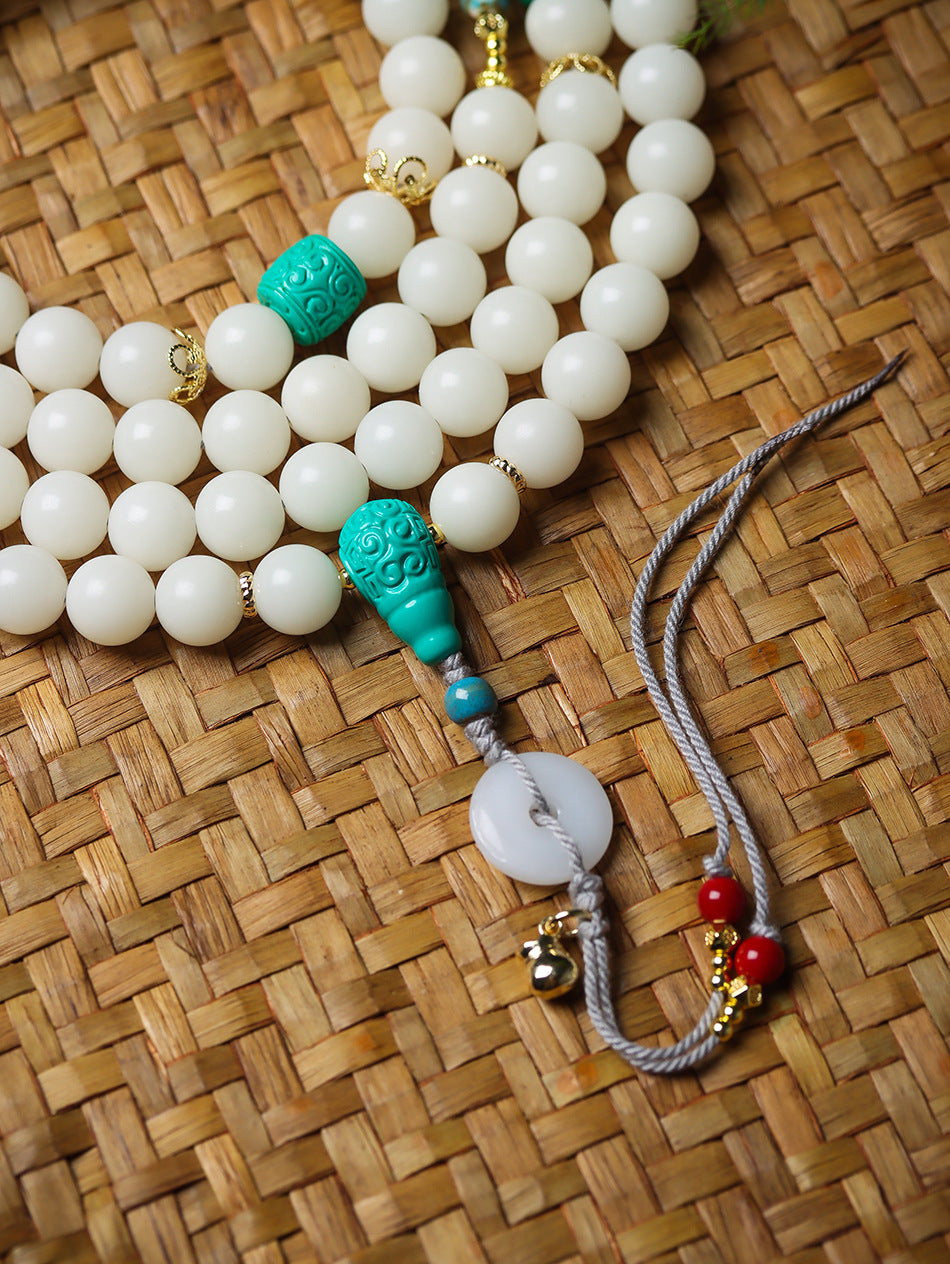✅ Materials: 108 high-polish white jade bodhi beads, turquoise-look accent beads, and a safety buckle charm