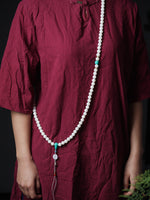 Gracefully handcrafted with 108 high-polish white jade bodhi beads, this mala necklace is accented with turquoise-look beads and features a traditional safety buckle charm. Designed for versatility, it can be worn as a flowing sweater chain or styled crossbody for a refined, modern aesthetic.