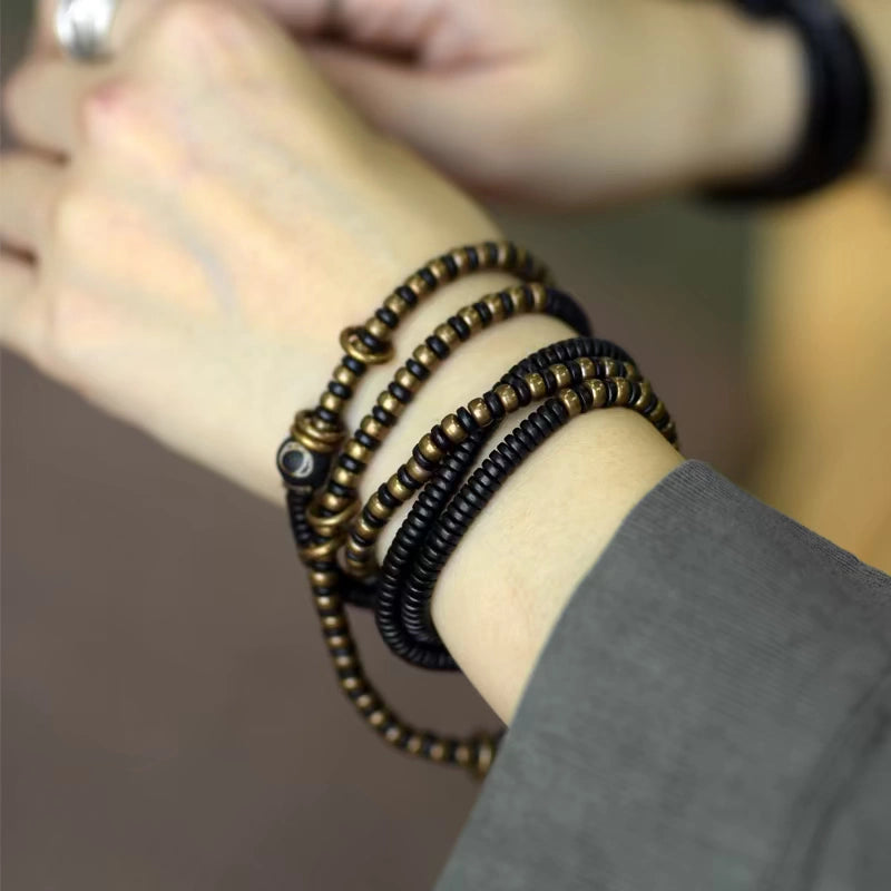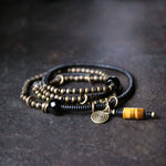 Ebony Wood Bracelet · Retro Brass & Wood Mix with Tiger Eye Pendant · Long Strand Wrap