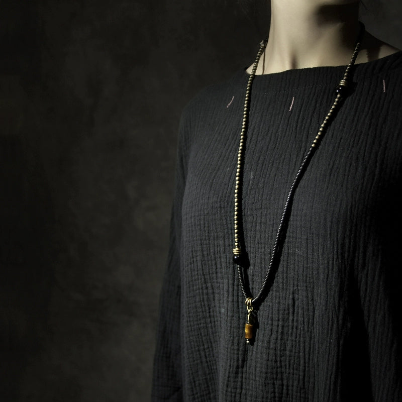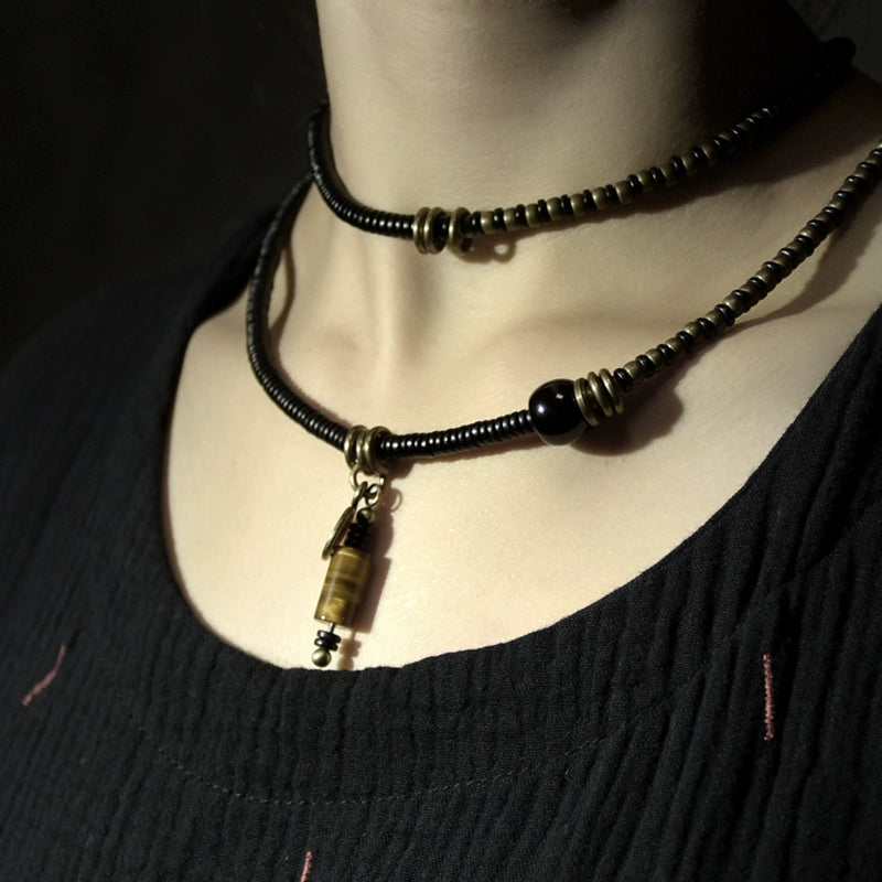 This handcrafted bracelet combines bold natural elements with a vintage spirit. Featuring dark ebony wood slices, antique brass spacers, and a polished tiger eye stone pendant, it offers both grounding energy and timeless character. The long strand design wraps comfortably around the wrist and can also be worn as a minimalist necklace — a striking piece for those who appreciate texture, meaning, and style.