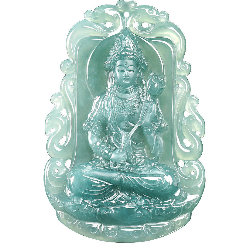 Experience divine compassion and spiritual empowerment with this natural blue water jadeite Mahasthamaprapta Guanyin pendant, carved from certified A-grade ice-type jade. Representing the Bodhisattva of wisdom and strength, this pendant embodies guidance, protection, and blessings. Its luminous blue water jade radiates serenity and vitality, making it a meaningful amulet for personal wear, meditation, or gifting.
