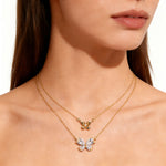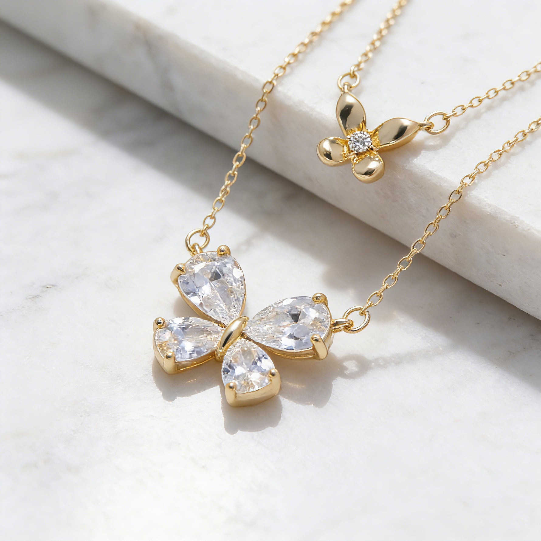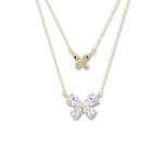 This Double Layer Butterfly Bow Necklace for Women is crafted from 925 sterling silver and finished in a refined gold tone. The layered design features a delicate butterfly charm on the upper chain and an elegant butterfly bow pendant on the lower chain, creating a graceful and feminine look. The flower charm measures approximately 8.2 mm, while the butterfly bow pendant measures about 13.8 mm in width and 10.4 mm in height, adding subtle sparkle and visual depth.