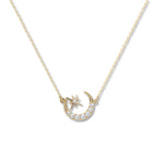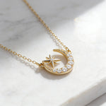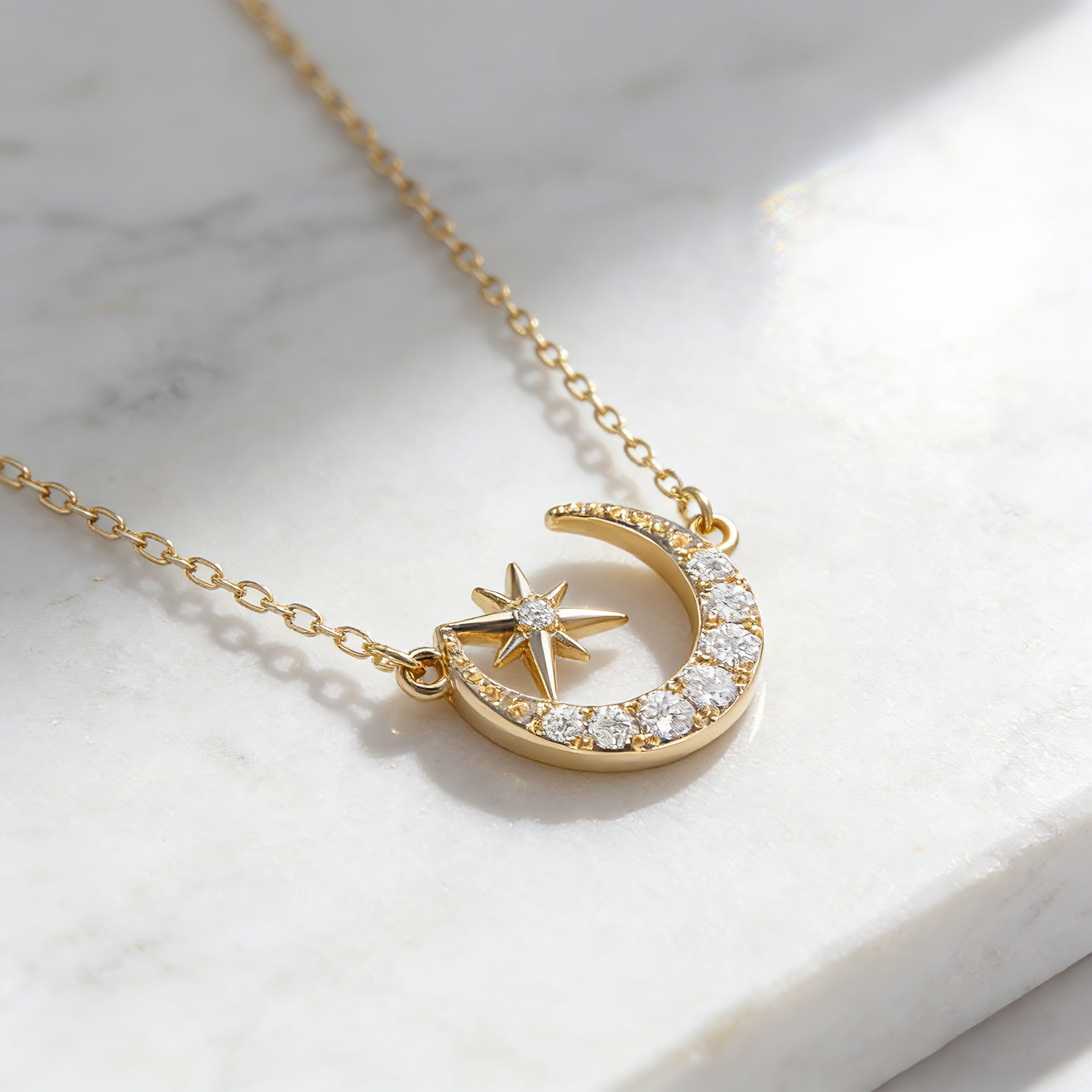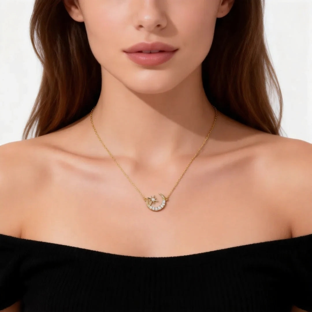 This Lucky Star and Moon CZ Necklace features a charming star and crescent moon design accented with sparkling cubic zirconia. Symbolizing hope, protection, and good fortune, the pendant measures approximately 10 mm × 10 mm, offering a delicate yet eye-catching presence. The polished finish enhances its brilliance, while the lightweight design allows it to rest comfortably along the collarbone. Elegant and fashionable, this necklace adds a touch of celestial charm to everyday outfits and special occasions alike.