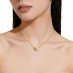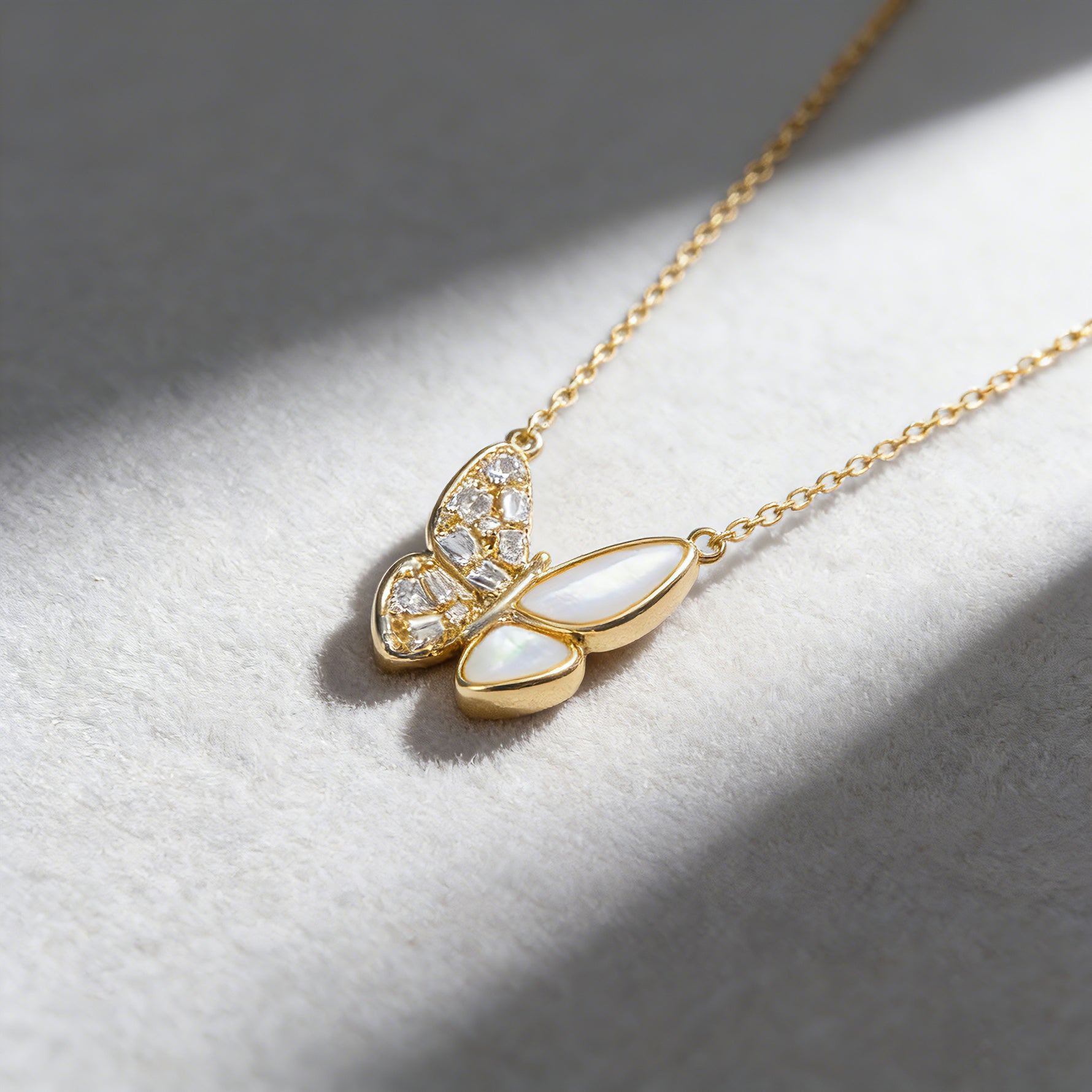 This White Mother-of-Pearl Butterfly Necklace with Sparkling Zircon Stones beautifully combines natural elegance with a touch of sparkle. The pendant measures approximately 1 cm in length, 1 cm in width, and 0.3 cm in thickness, featuring a delicate butterfly design inlaid with shimmering white mother-of-pearl and accented with dazzling zircon stones.