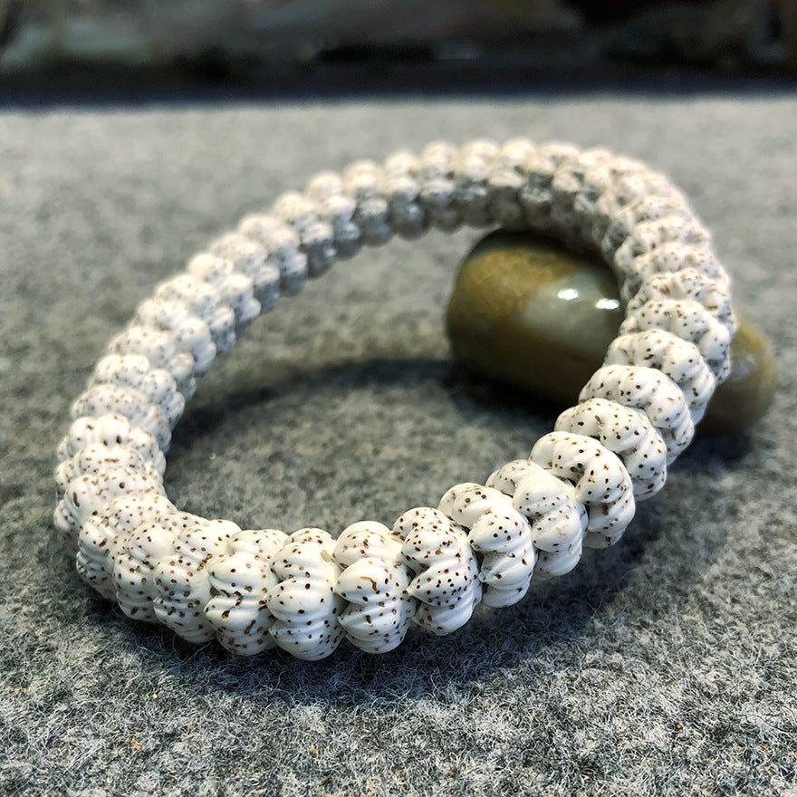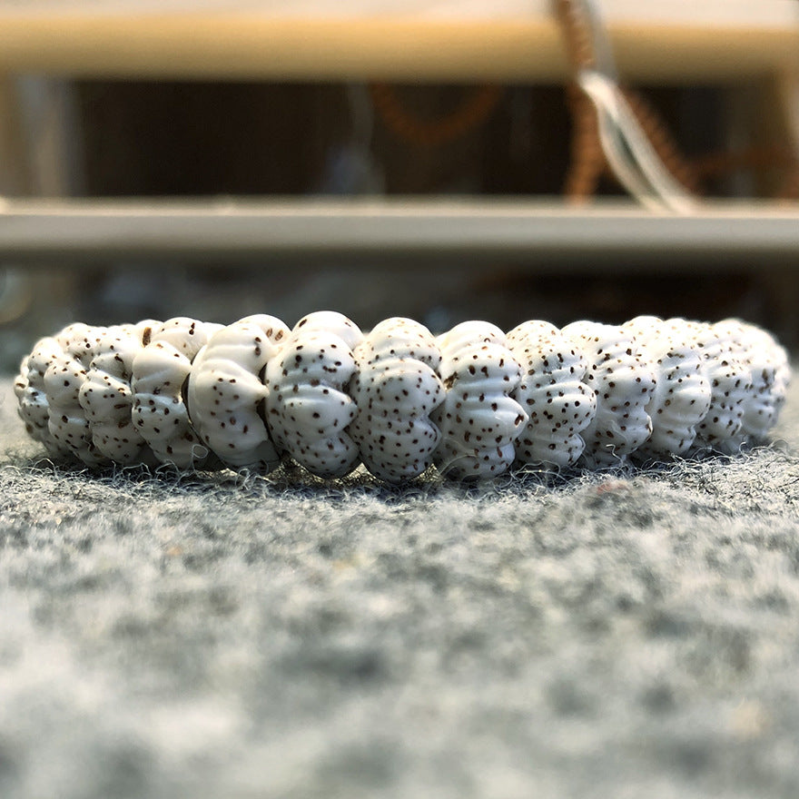 This bracelet features 12mm high-density Star and Moon Bodhi beads, meticulously hand-carved into a lotus shape while preserving the seed’s natural texture and structure. The natural white color enhances its clean and refined aesthetic.