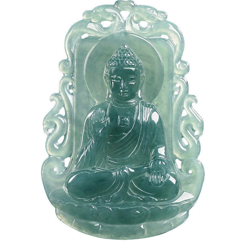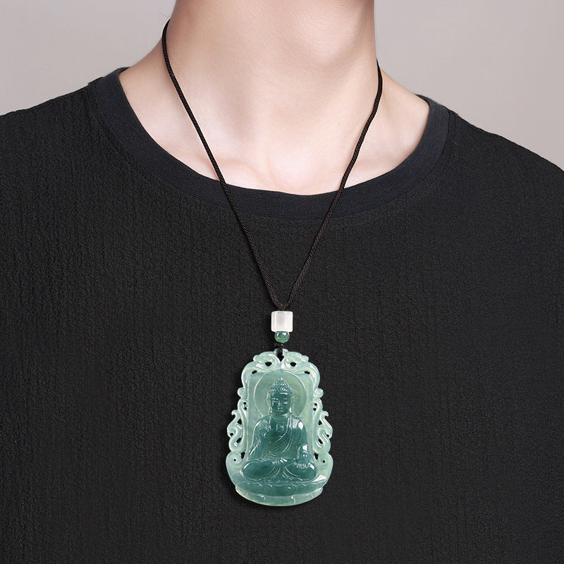 Natural Blue Water Jadeite Amitabha Buddha Pendant – A-Grade Jade, Zodiac Dog & Pig Guardian Talisman