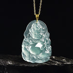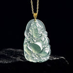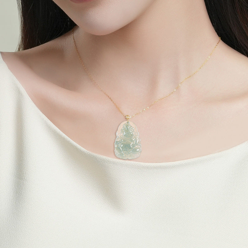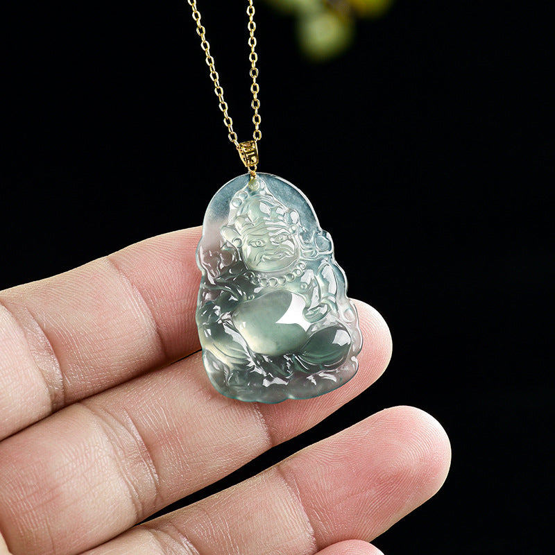 🌿 Product Description Invite abundance and spiritual protection with this natural A-grade blue water jadeite Yellow Wealth God pendant, set with an 18K gold bail and accompanied by a silver chain. Its ice-type translucency and elegant carving radiate clarity and vitality. The pendant symbolizes wealth, fortune, and success, making it a meaningful accessory for both men and women who seek prosperity and balanced energy in life.