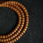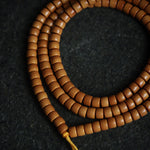 This Wenwan Thick-Sliced Olive Pit Apex 108 Mala Beads Bracelet is made from natural olive pits sliced thickly to retain volume and texture. Featuring beads shaped from the apex (tip) of the pits, it offers a solid feel and natural beauty. The 108 beads are strung together for meditation and daily hand playing, developing a warm patina over time.