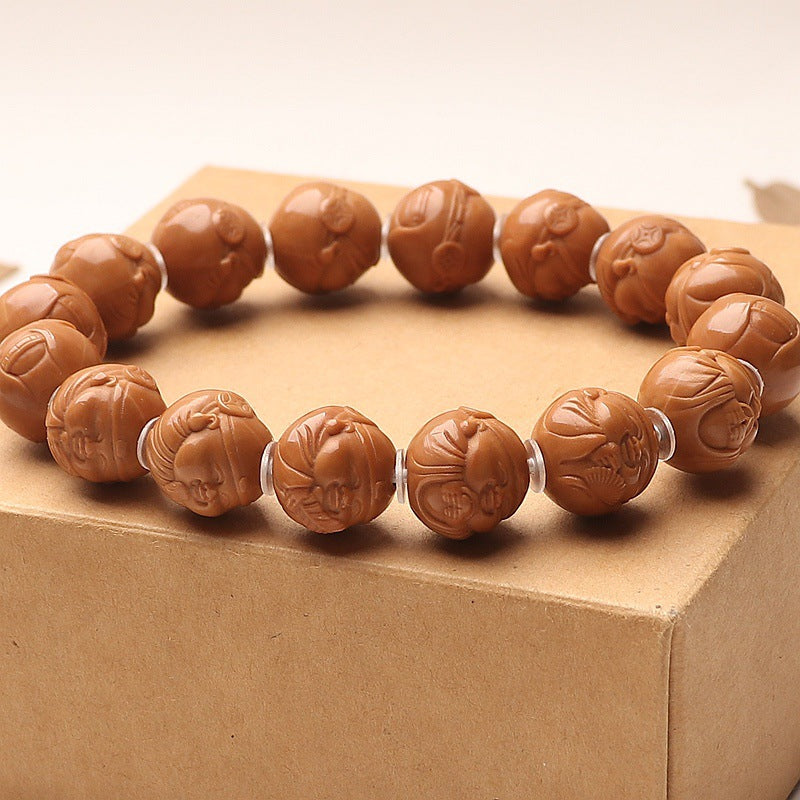 This bracelet is crafted from premium monkey head walnuts, featuring hand-carved "Fortune God" patterns (symbolizing wealth and good luck in Chinese culture). Each 14mm bead showcases delicate, vivid carvings—with the Fortune God’s joyful expression and auspicious details fully presented. The warm, natural walnut texture pairs with clear spacer beads, making it both a decorative accessory and a meaningful lucky charm that develops a rich patina with wear.