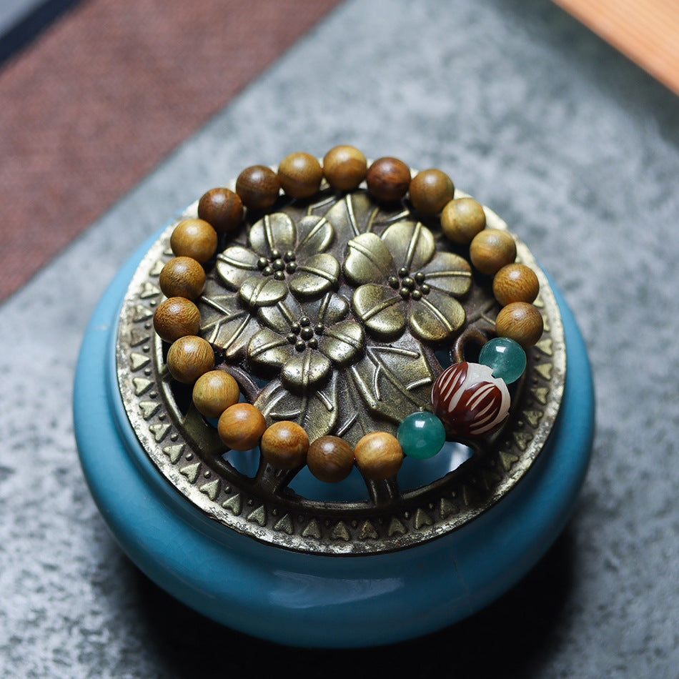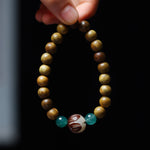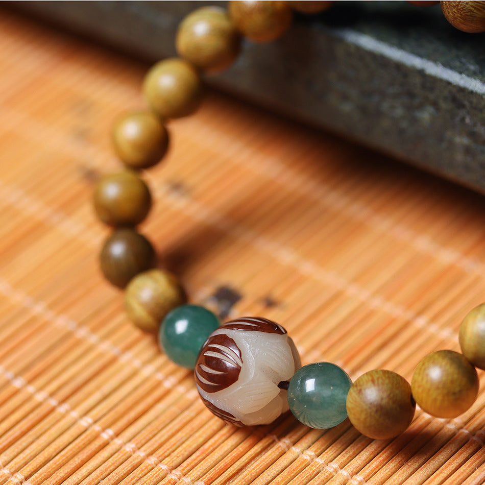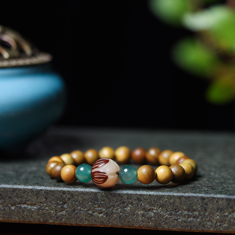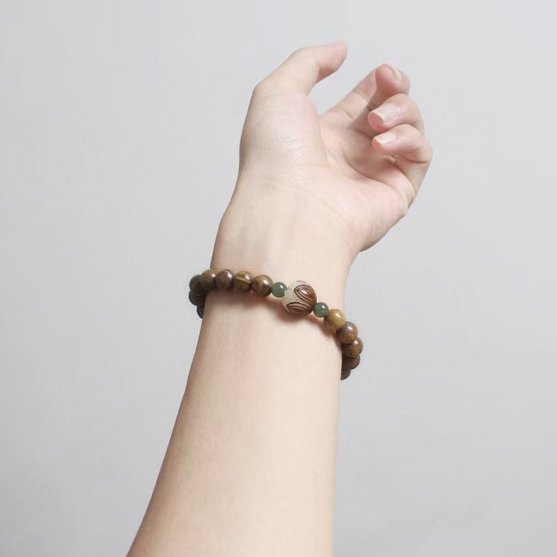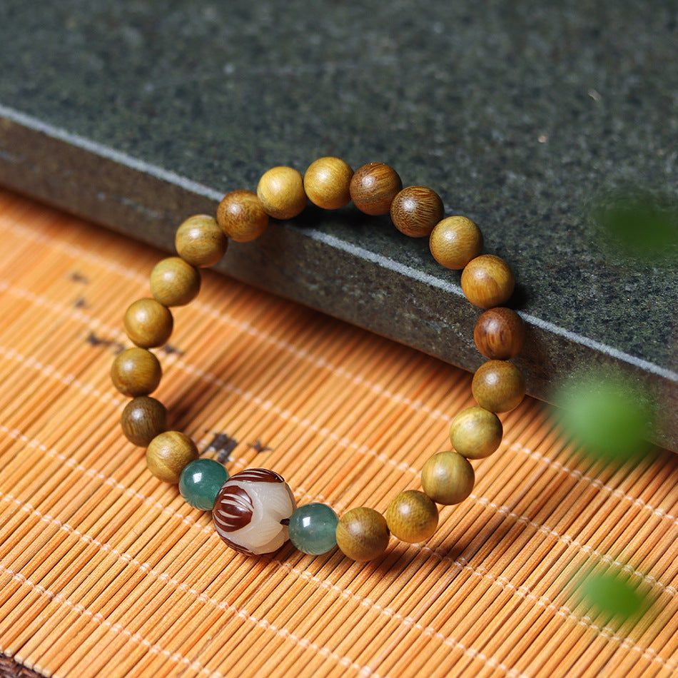 Materials: Rare Argentine old-growth green sandalwood (8mm), natural 6mm Hetian jade, 12mm hand-carved Bodhi root lotus charm