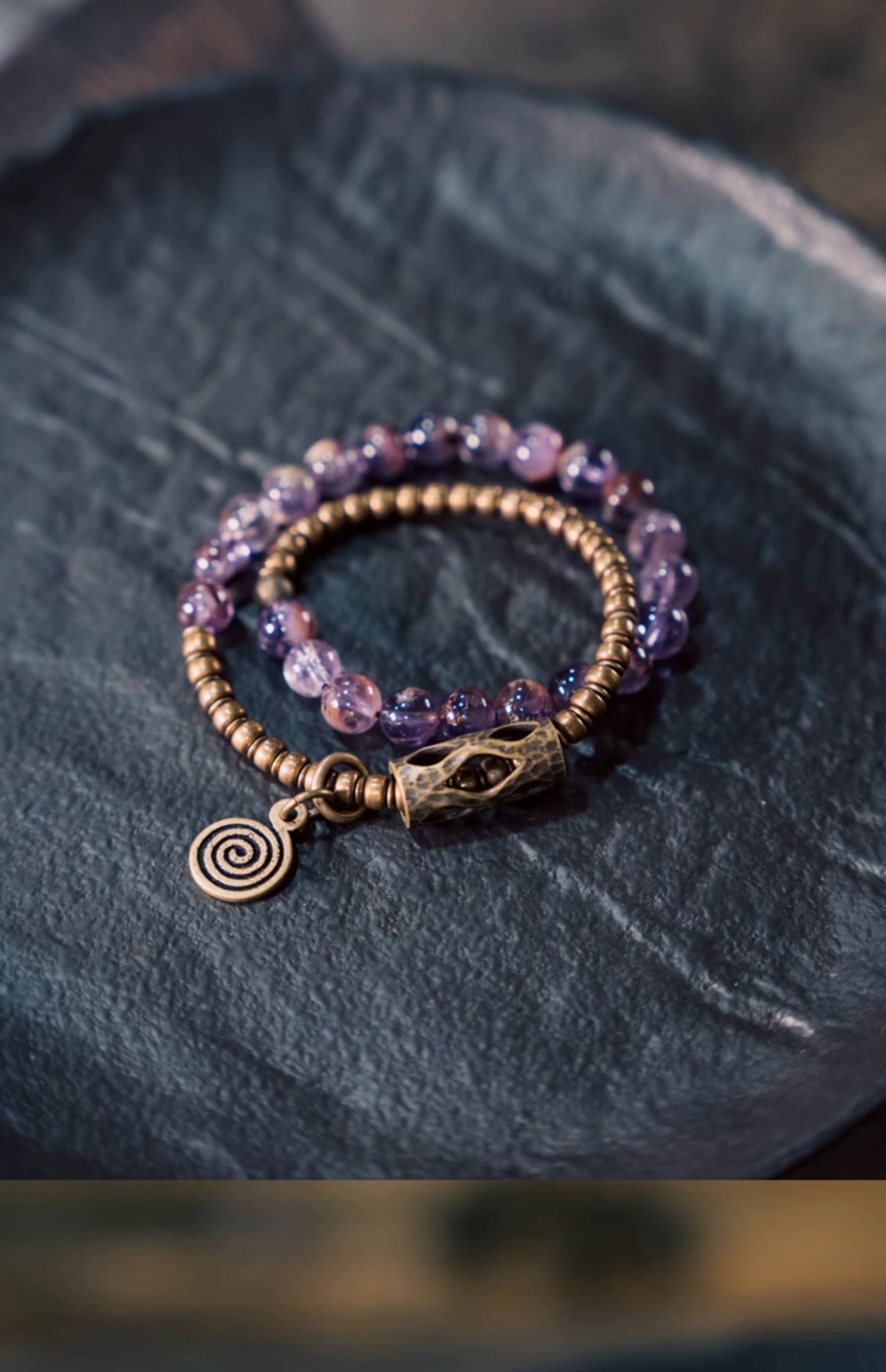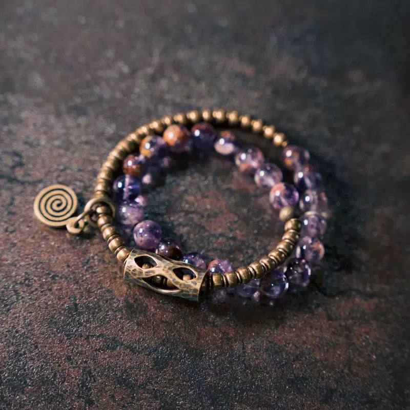 Vintage Double-Wrap Amethyst Phantom Quartz Bracelet – Brass Accents & Spiritual Style