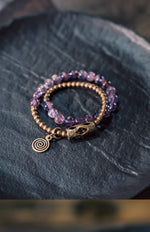 This handcrafted double-wrap bracelet features 8mm amethyst phantom quartz beads paired with vintage-style brass spacers, combining spiritual elegance with Tibetan-inspired charm. The long, layered design wraps comfortably around the wrist twice, making it perfect for daily wear, meditation, or mindful moments.