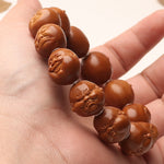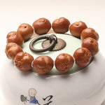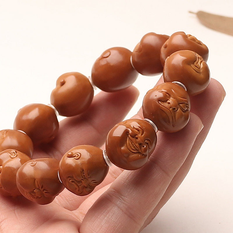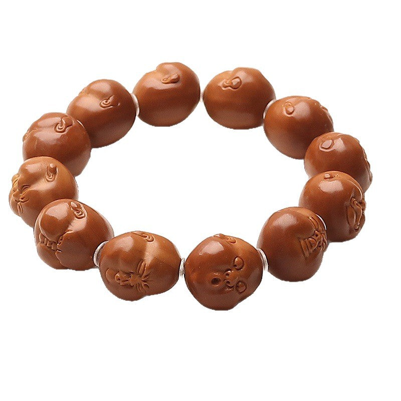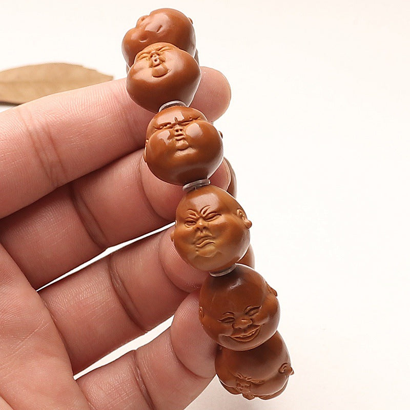 This elegant single-loop bracelet is expertly crafted from premium iron-core olive pits, renowned for their natural beauty and rich texture. Each 18mm bead is meticulously hand-carved with unique human facial expressions, ranging from joyful smiles to serene calmness, capturing a vivid spectrum of emotions. The smooth, glossy surface of the olive pits is complemented by clear spacer beads, enhancing the depth and clarity of the carvings. More than a Wenwan accessory, this bracelet is an expressive craft piece that gains warmth and character as it develops a deeper patina over time.