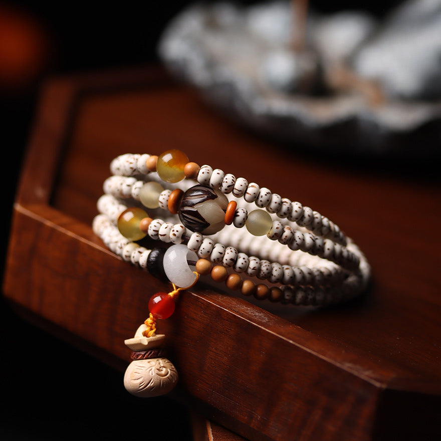 This 3-style bracelet features mini 3×5mm Star and Moon Bodhi beads, paired with a finely carved boxwood lucky bag accent, as well as green agate and red agate accents. The smooth texture of the mini Bodhi beads combined with the intricate wood carving creates an elegant and meaningful accessory, perfect for daily wear or spiritual focus.