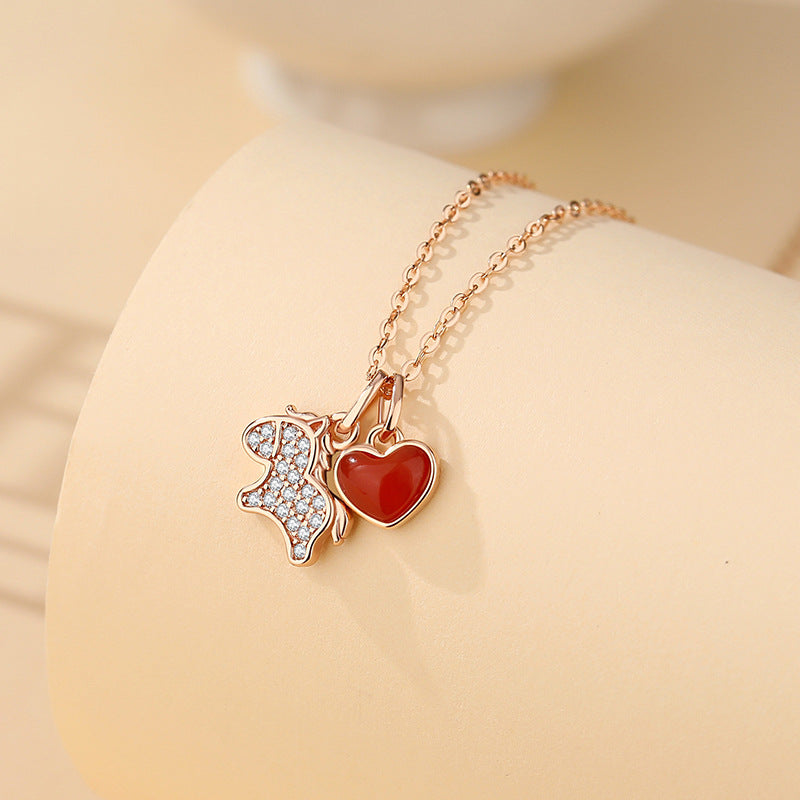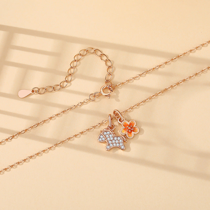 This Women’s S925 sterling silver necklace features a cute Year of the Horse charm paired with a four-leaf clover (or heart/peach blossom) accent, crafted with cubic zirconia and red agate. Designed for birth year luck, it blends zodiac symbolism and delicate details, making it a stylish and meaningful choice for horse natives.