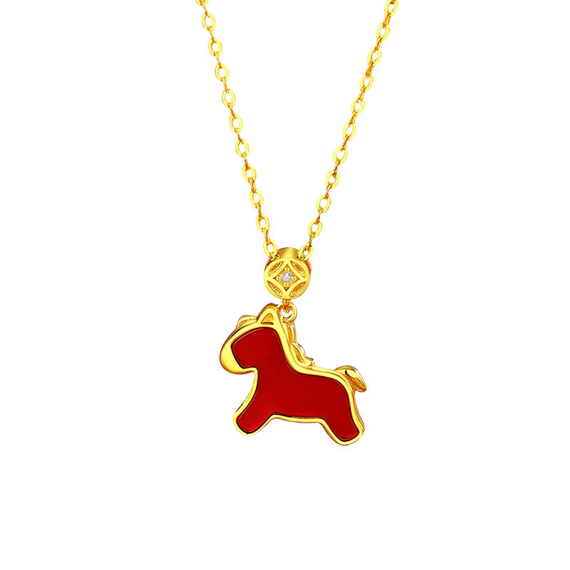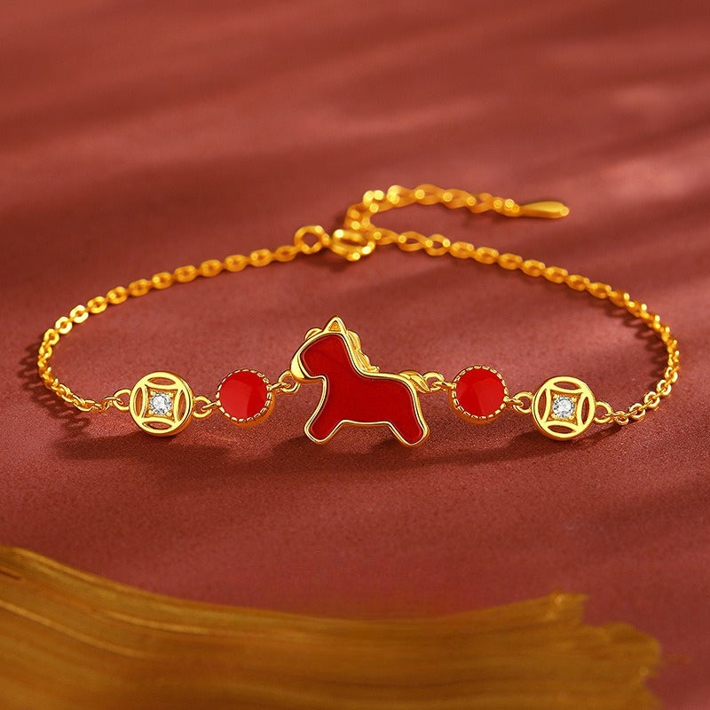 In Chinese culture, the horse symbolizes vitality and prosperity, red agate represents good fortune and protection, and the fortune-themed design embodies wishes for immediate wealth and luck. This set is a meaningful combination of zodiac energy and traditional fortune symbolism.