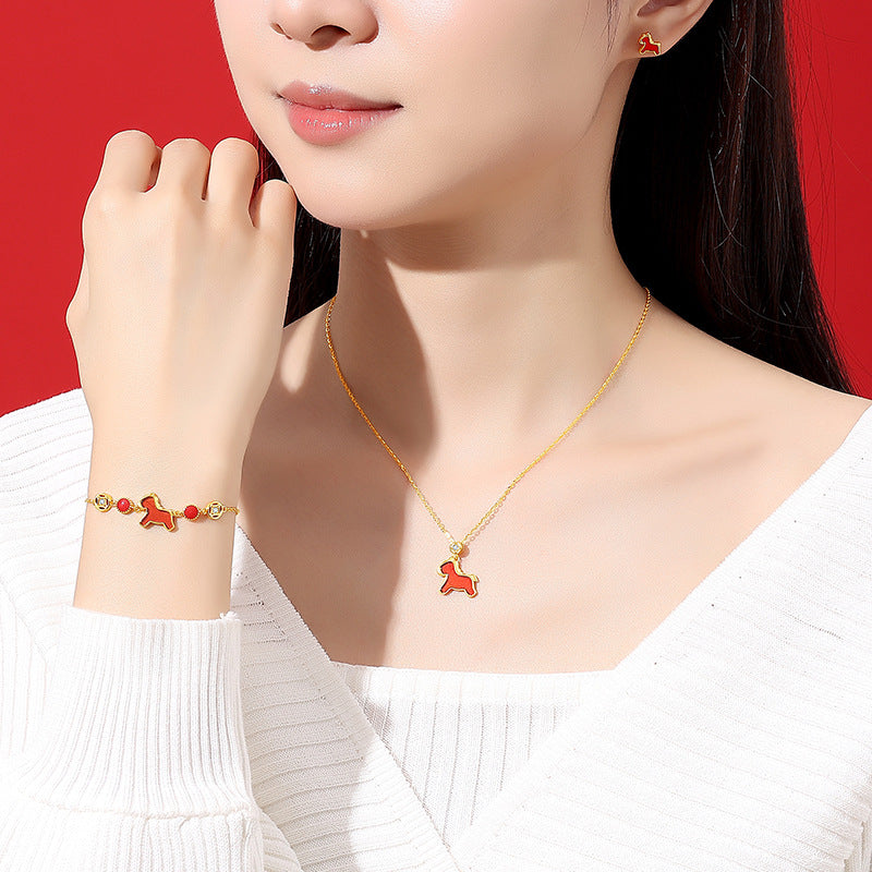 This Year of the Horse fortune jewelry set consists of a necklace, bracelet, and earrings, all adorned with a cute red agate horse design. Made with S925 silver and cubic zirconia, it combines traditional fortune symbolism and elegant craftsmanship, making it a lucky and fashionable choice for women.