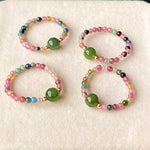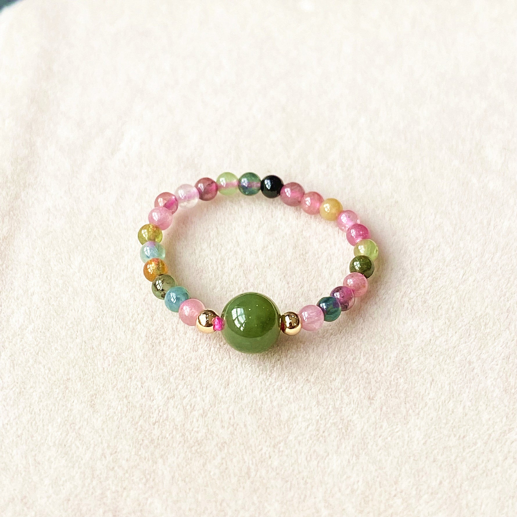 Experience the perfect blend of natural beauty and comfort with this women’s stretch ring featuring genuine green jade and vibrant tourmaline beads. The flexible band adjusts smoothly to fit most fingers, making it ideal for everyday wear. The combination of smaller accent beads (≈2.8mm) and a larger central bead (≈6mm) adds a subtle yet meaningful touch of elegance to any outfit.