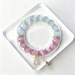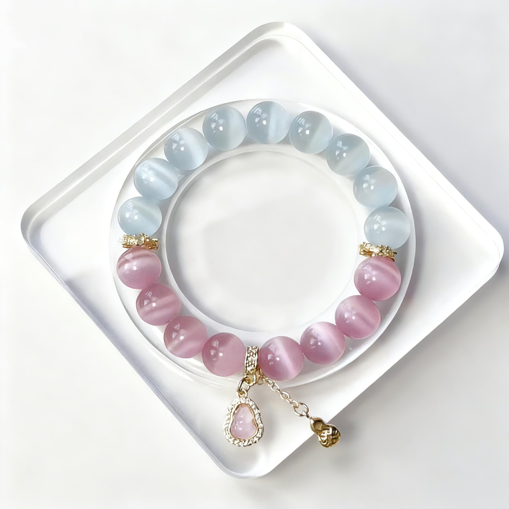 Bring calm, beauty, and good fortune to your day with this elegant White & Pink Cat Eye Crystal Bracelet. Handcrafted with shimmering cat eye beads, it symbolizes clarity, intuition, and self-love. The gourd-shaped charm adds an Eastern touch — a timeless talisman for health, harmony, and protection. Designed for everyday wear or as a heartfelt gift, this bracelet is also customizable to reflect your unique style and energy.