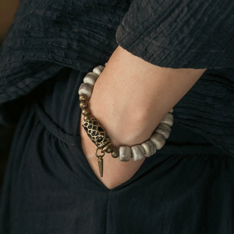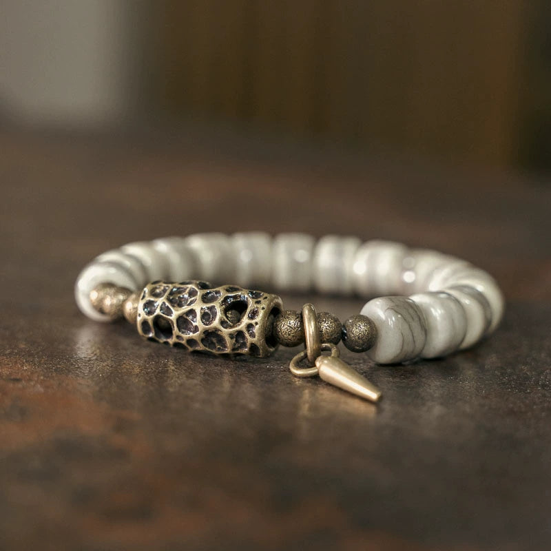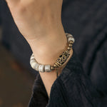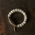 This handcrafted single-wrap bracelet features smooth, natural yak bone beads accented with warm brass elements. Rooted in Tibetan tradition, the design balances raw earthiness with refined craftsmanship—offering a subtle yet powerful accessory for everyday wear.