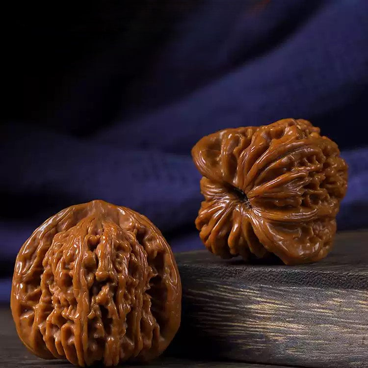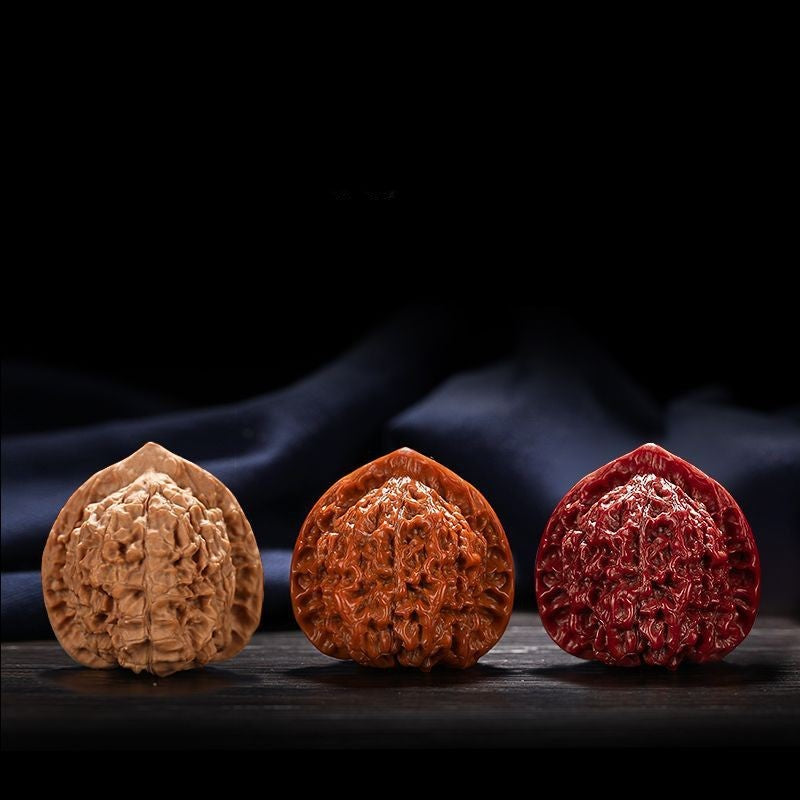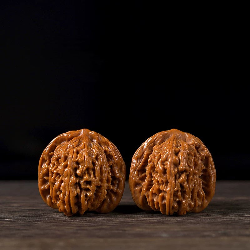 Wenwan walnuts, also known as hand-playing walnuts, are different from ordinary edible walnuts. They come from specially cultivated or naturally occurring walnut varieties known for their hard shells, elegant textures, and symmetrical shapes. Over time and with frequent handling, they develop a glossy surface, gradually darkening from light yellow to deep red, with a smooth, porcelain- or agate-like finish.