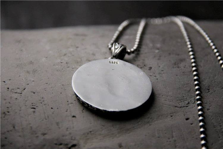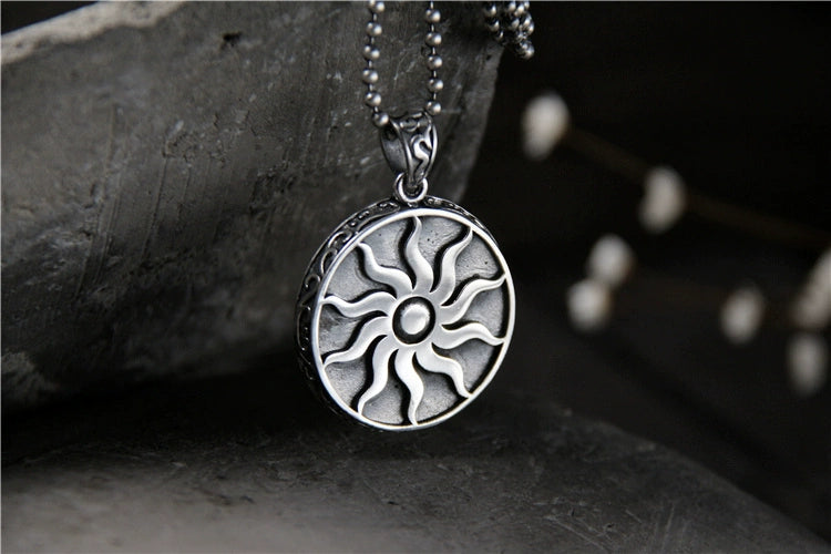 This solid 925 sterling silver sun pendant features a powerful and masculine design, crafted with bold lines and intricate detailing. Its substantial weight and polished finish give it a strong presence, making it an ideal accessory for men who appreciate statement jewelry with symbolic depth and artistic craftsmanship.