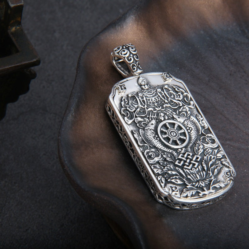 This 925 sterling silver Yellow Jambhala pendant features a traditional Tibetan design with detailed engraving and a bold spiritual presence. Its solid weight and elongated form make it a striking piece for anyone who values Buddhist symbolism, wealth blessings, and protective energy.
