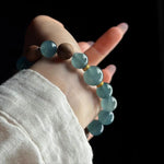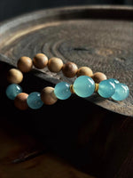 This luxurious bracelet features large 10mm blue water jadeite beads paired with sacred Indian old sandalwood, creating a striking balance of elegance and spiritual energy. Each bead is hand-selected for clarity, natural energy, and texture, offering both a visually impressive and spiritually meaningful accessory.
