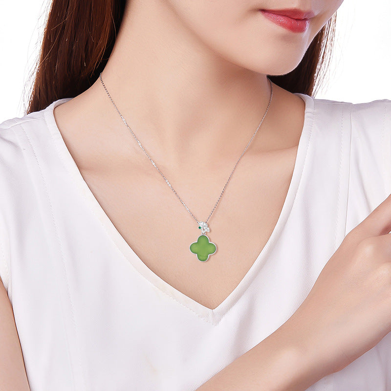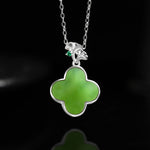 Natural Spinach Green Aged Hetian Green Jade Four-Leaf Clover Pendant with S925 Silver for Women